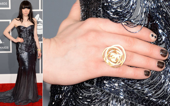 Carly Rae Jepsen entrou na tendência filha única, deixando a unha do dedo indicador clarinha e com dois quadradinhos metálicos! Nas outras, combinação de esmalte preto + camada de glitter.