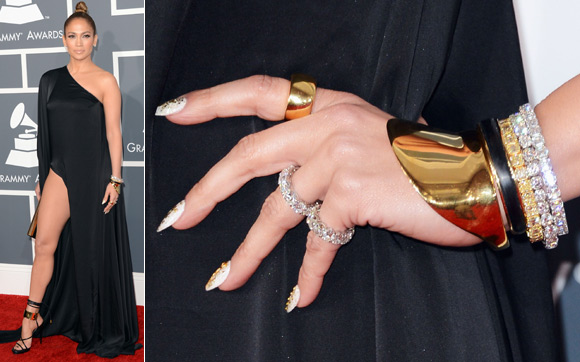 Jennifer Lopez deixou as unhas da mesma cor dos acessórios: esmalte branco na base e glitter + pontinhos de esmalte dourado. Glam!