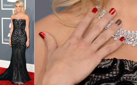 Carrie Underwood também aderiu à filha única, mas deixando a unha do dedo anelar diferente! Ela escolhe esmaltes vermelho e bronze, ambos cintilantes.
