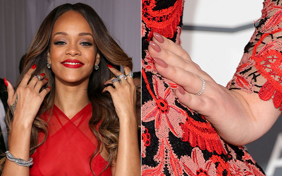 Rihanna e Adele não investiram em uma nail art específica, mas surgiram com unhas bem pontudas, tendência desde 2012 . Não é que ela pegou mesmo entre as famosas?!