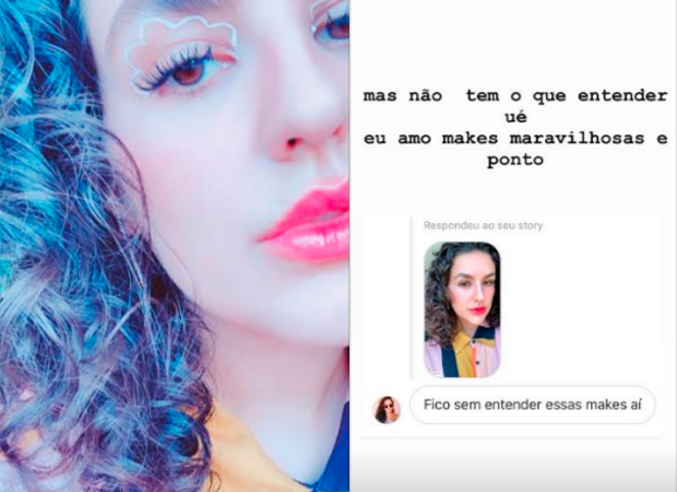 Em seus Stories, Kéfera mostrou que estava usando uma espécie de delineado em forma de nuvem. Em vez de estar traçado rente aos cílios, o desenho seguia a linha do côncavo. Total vibes Jules, personagem de Hunter Schafer em Euphoria, né? Uma garota, então, enviou uma mensagem dizendo que não entendia esse tipo de maquiagem. A atriz decidiu publicar a crítica e escreveu: “Não tem que entender. Eu amo makes maravilhosas e ponto”.