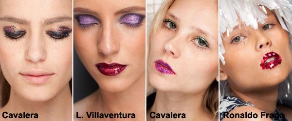 A tendência: o glitter vem para dar um toque super glam ! Nos olhos, apareceu borradinho ou então mais certinho, dentro do limite da pálpebra. Até nos lábios teve glitter (e lantejoulas!).