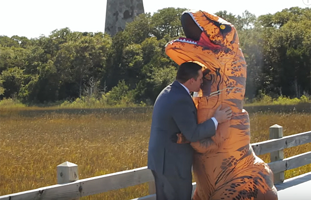 Eis que uma noiva maravilhosa, chamada Elizabeth, decidiu inovar e aparecer no próprio casamento vestida de dinossauro. Calma, tudo não passou de uma zoeira organizada pela mulher e alguns convidados, tirando onda com o fato de o noivo só poder ver a noiva vestida na hora da cerimônia. Para surpreender Tom no altar, Beth colocou uma roupa de T-Rex sobre o tradicional vestido branco e… Bem, se a gente contar, não vai ser tão divertido. É preciso assistir ao vídeo!