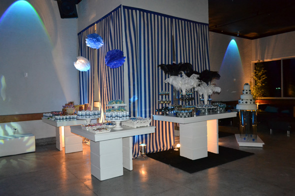 Para combinar com o tema, a Lara escolheu as cores azul preto e branco para compor a decoração. Ficou luxo, né?