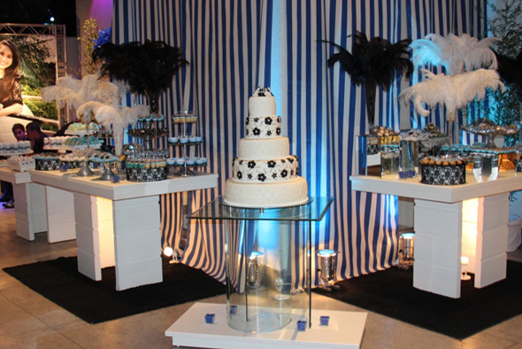 “A festa foi feita em uma balada e, por isso, preferi uma decoração que fosse clássica e, ao mesmo tempo, bem moderninha. Usamos plumas no lugar de flores, painéis estampados, velas, suportes de doces metálicos, espelhos, etc”, lembra.