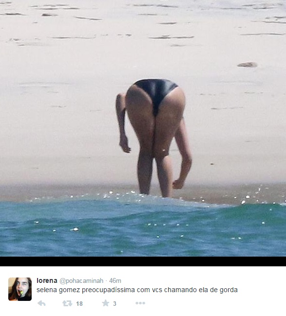 Teve gente falando que a Sel havia “engolido o Justin Bieber”, teve gente especulando que ela estaria grávida e teve também aquelas pessoas que culparam o modelito do biquíni. A verdade é que nada justifica o fato de reproduzirmos duas ou três imagens e criarmos todo um tumulto em cima delas, enquanto as outras fotos mostram que não há nada de errado com o corpo da Selena . As tirinhas do biquíni podem ter marcado um pouquinho? Podem. O ângulo das fotos pode não ter ajudado? Pode. A Selena pode ter engordado? Pode. Mas e daí?