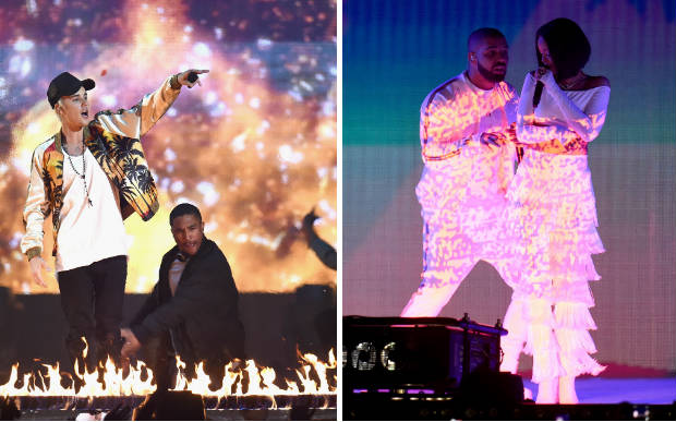 Justin Bieber, Rihanna (com direiro a uma aparição surpresa de Drake), Little Mix, The Weeknd, Coldplay, Jess Glynne e James Bay também cantaram na premiação. Lorde surpreendeu ao se juntar à banda de David Bowie e fazer uma homenagem ao cantor com a música Life on Mars.