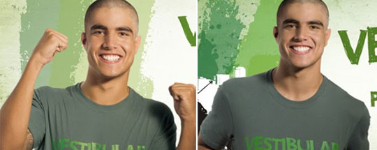 Vimos uma propaganda em que o Caio Castro aparece, supostamente, raspando o cabelo e ficando totalmente careca porque conseguiu passar no vestibular.