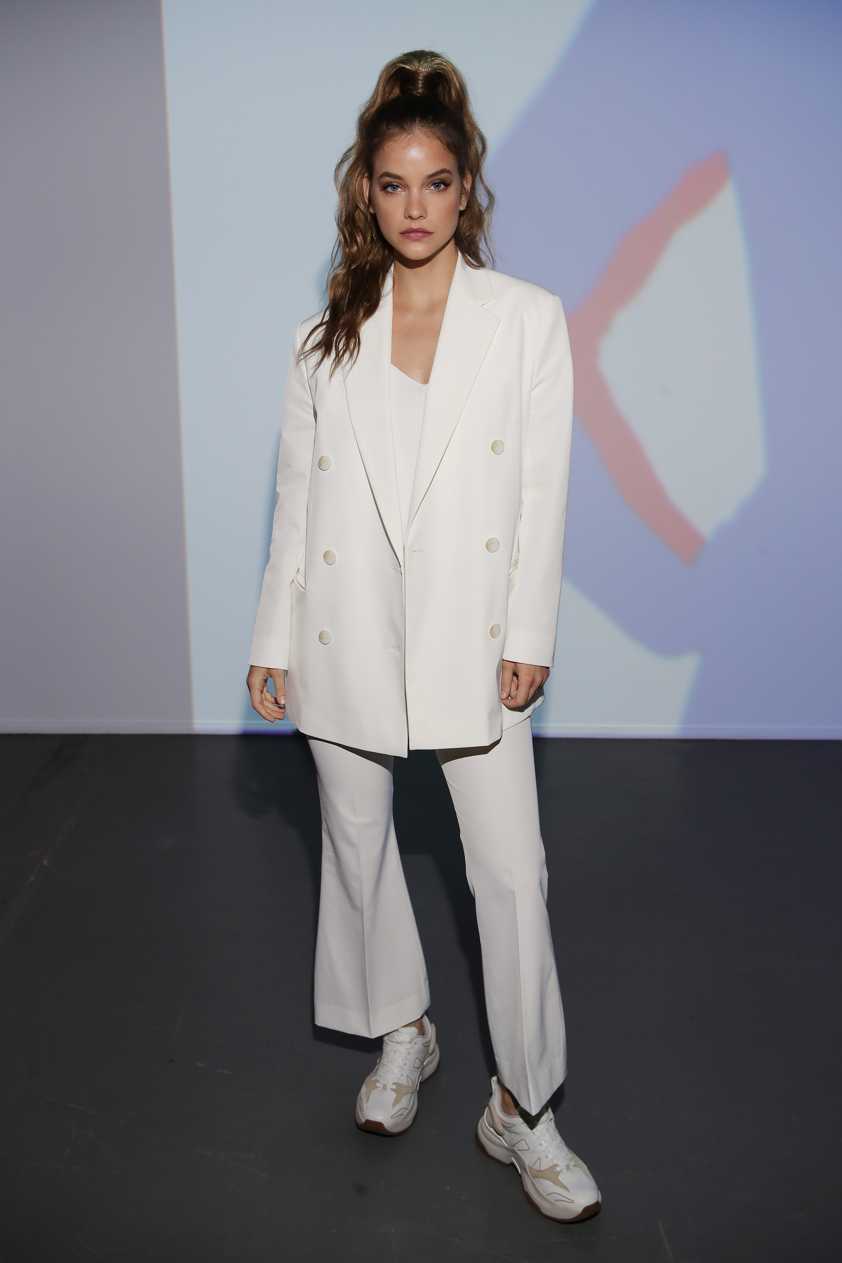Barbara Palvin escolheu o tênis esportivo para dar uma ~quebrada~ no conjuntinho de blazer e calça de alfaiataria.