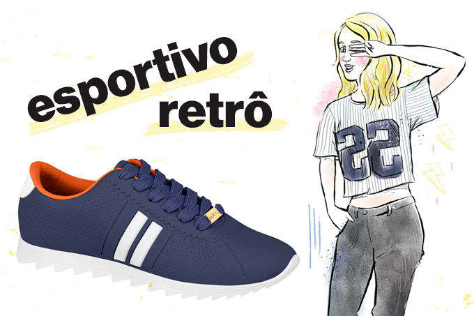 O tênis azul com detalhes brancos da Moleca é a companhia perfeita para a dupla que a gente mais ama na vida, o jeans e a camiseta, que agora tem uma cara mais retrô, com números grandes e inspiração em esportes como o beisebol e o basquete. Esse estilo esportivo que apareceu nas passarelas e está nas ruas do mundo todo vai superbem na escola, no shopping e no vai e vem de todo dia.