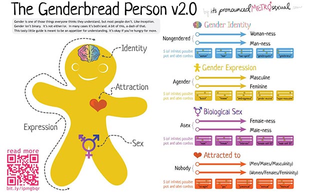 Acima, um gráfico publicado na pesquisa The Genderbread Person, que explica que o binarismo (não se identificar nem pelo sexo masculino nem pelo feminino) é uma questão de identidade, trabalhada na mente da pessoa, enquanto a transgenia é uma questão biológica. Um não-binário não visa a mudança de sexo, como um transgênero, porque, simplesmente, não se identifica com nenhum dos dois gêneros.